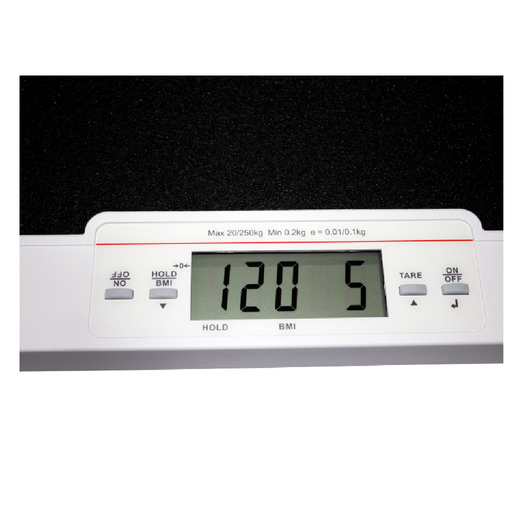La Balanza Digital de Uso Médico tiene una estructura en acero, con sistema de encendido y apagado automático, display digital incorporado y capacidad de carga de 250 Kgs. Tiene pantalla LCD doble operada por usuario y médico. Tiene función ON/OFF, Tara, HOLD, BMI (Índice de Masa Corporal) y cuenta con la opción de pesar al bebé en brazos de su madre. Lectura en KGS o Lb. Las medidas del dispositivo es de 345 x 350 x 45 mm y su peso es de 2.5 KGS. Funciona con 4 pilas AA y/o adaptador de corriente de 110V. Diseñada para uso en conjunto con el Tallímetro Análogo HM202P.