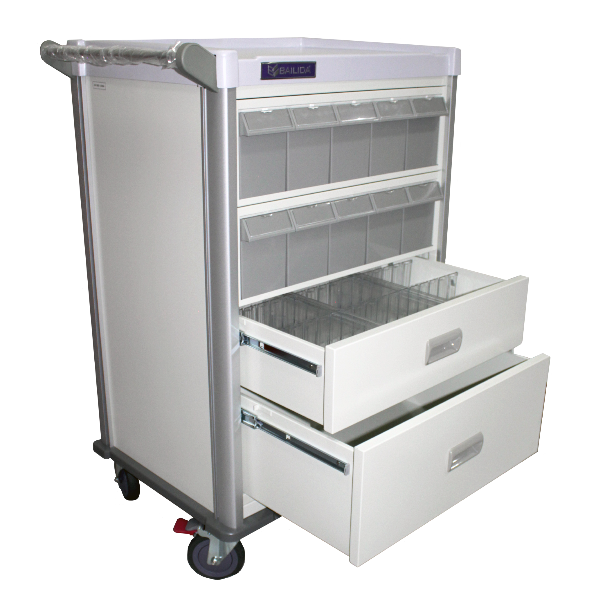 Carro para distribución de medicamentos intrahospitalario de doble apertura anterior y posterior, estructura en aluminio y polipropileno ABS. Superficie en PVC de fácil limpieza. Cuenta con bandeja lateral retráctil, 2 cajones anteriores con cinco cajillas cada uno y 2 cajones posteriores con cinco cajillas cada uno. Cajillas de 6″ para medicamentos con divisiones, 1 cajones de 6″ auxiliar para accesorios, 1 cajón de 9″ para accesorios de gran tamaño. Sistema central de seguridad, pasamanos en aluminio. Medidas: alto 101 cm x frente 69 cm x fondo 54 cm. Ruedas de 5″ en PVC; dos con freno. Sistema de bómper en aluminio y ABS resistentes.
