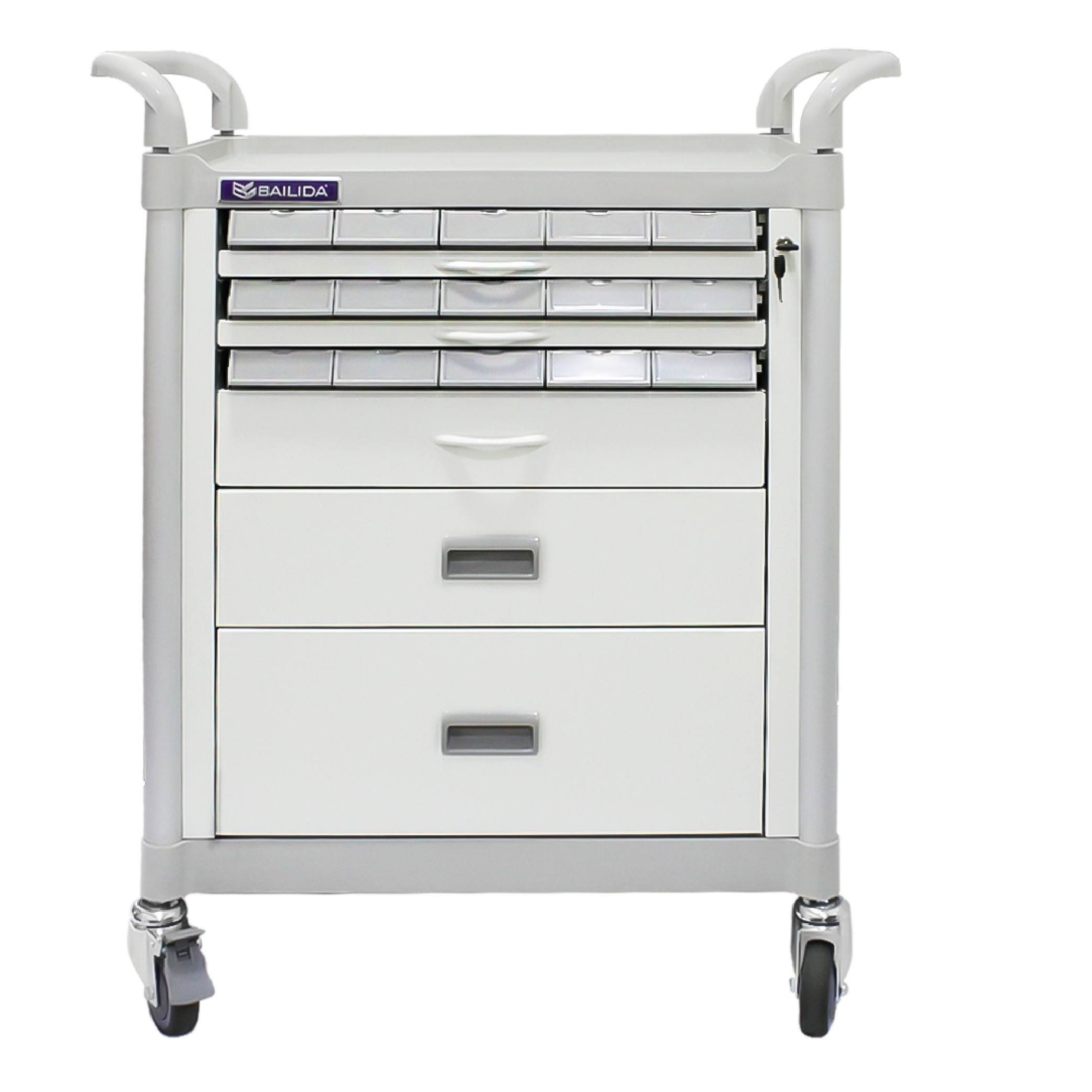 Carro para distribución de medicamentos intrahospitalario. Cuenta con 3 cajones anteriores, cada uno, con 5 cajillas, 3 cajones posteriores, cada uno, con 5 cajillas, todos con divisiones y rieles en aluminio de cierre suave. Estructura en aluminio y polipropileno ABS. Compartimiento inferior para accesorios complementarios. Sistema central de seguridad y pasamanos en polipropileno ABS. Medidas: Alto: 109 cms, Frente: 76 cms, Fondo: 49 cms.