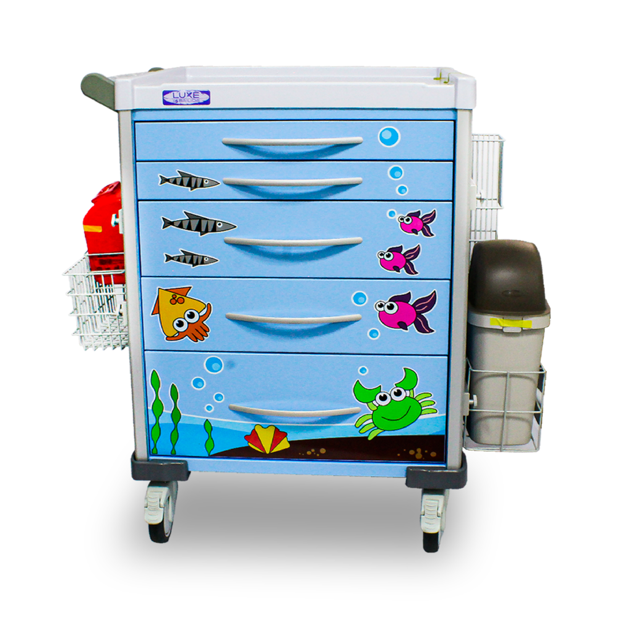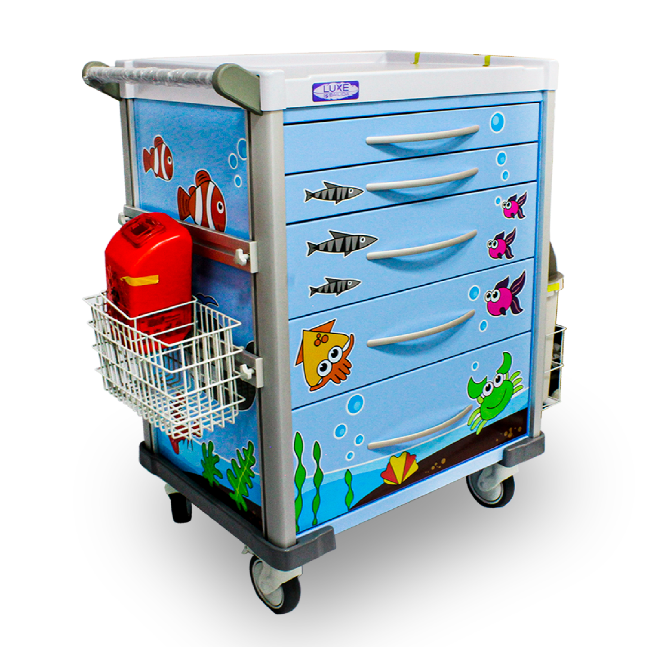 Este modelo de la serie LX cuenta con un diseño especial para pediatría con motivos infantiles. Multifuncional en diferentes áreas del hospital; ofrece estabilidad, movilidad y un conveniente cambio de accesorios. Tiene 5 cajones con rieles de aluminio de suave desplazamiento y cierre, con sistema autoretorno, dos de esos cajones de 3″ para medicamentos, otros dos de 6″ para accesorios y uno cajón 9″ para dispositivos medicos. Dos ruedas TPR de 5″ en PVC y 2 con freno. Cuenta con sistema de seguridad central, superficie removible en PVC con ABS, pasamanos / manija en aluminio y bomper parachoques. Medidas: 101 cm x 69 cm x 54 cm.