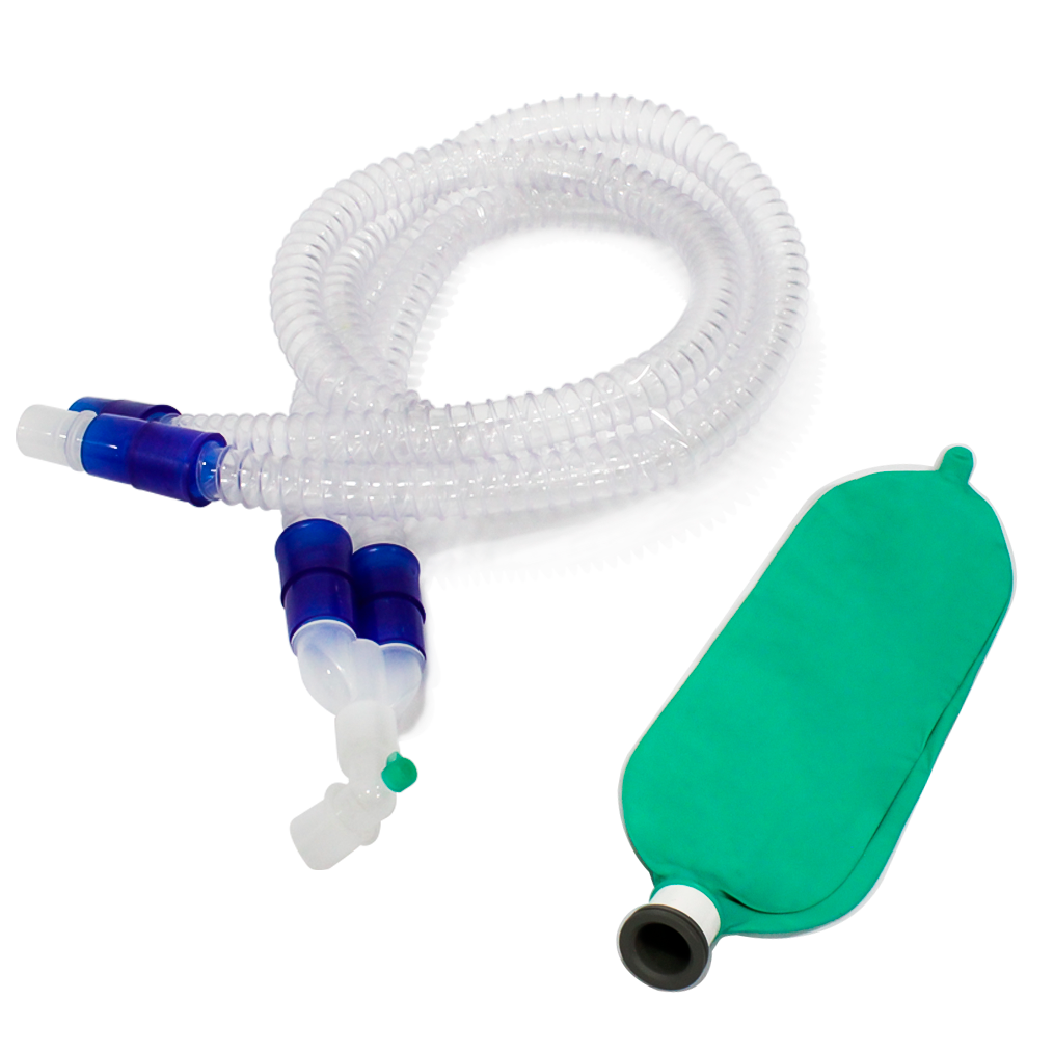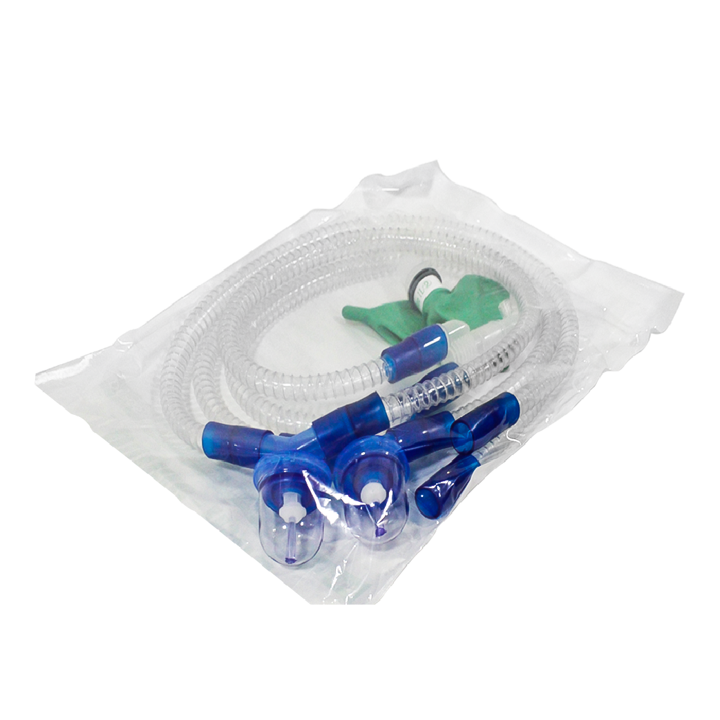 Circuito con balón de 3 litros (Adulto) libre de látex. Longitud de 160 cms. Mangueras de inhalación y exhalación, codo de 90° con puerto para CO2, YE paralela con 2 puertos. Conectores semirrígidos de 22 mm. Con o sin 2 trampas de agua. Balón de 1 litro (Pediátrico) libre de latex Longitud de 160 cms. Mangueras de inhalación y exhalación. Codo de 90° con puerto para CO2 YE paralela con dos puertos .Dos trampas de agua. Conectores semirigidos de 22 mm.