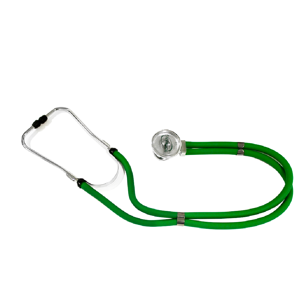 Campana doble para alta y baja frecuencia, tipo enfermera, tubo binocular en PVC, tubo doble fabricado en polipropileno, olivas intercambiables, colores surtidos. Uso adulto – pediátrico (edad escolar). Accesorios: 1 par de olivas y 1 diafragma.