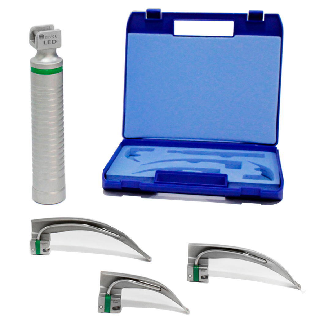 Kit de laringoscopio de fibra óptica para uso adulto, compuesto por: Hoja reusable para laringoscopio curva #2, #3, #4, mango mediano de luz LED con capacidad de 2.5 voltios y estuche plástico rígido tipo maletín.