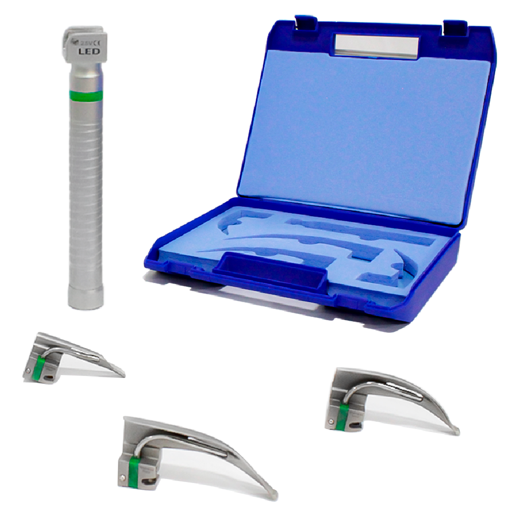 Kit de laringoscopio de fibra óptica para uso pediátrico, compuesto por: Hoja reusable para laringoscopio recta #0, hoja curva #1 y #2, mango delgado de luz LED con capacidad de 2.5 voltios y estuche plástico rígido tipo maletín.