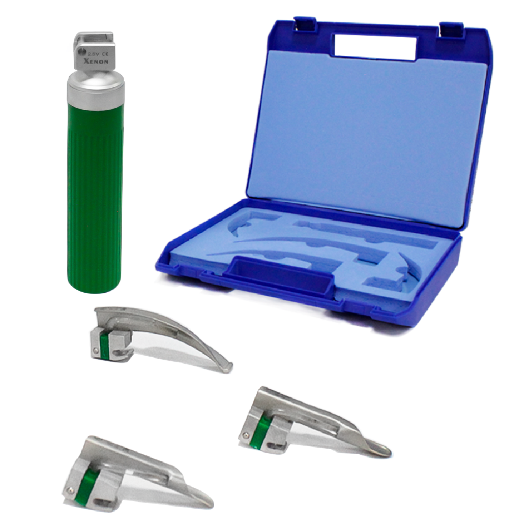 Kit de laringoscopio de fibra óptica para uso pediátrico, compuesto por: Hoja desechable para laringoscopio recta #00, #0, hoja curva #1, mango mediano en PVC de luz Xénon, con capacidad de 2.5 voltios y estuche plástico rígido tipo maletín.