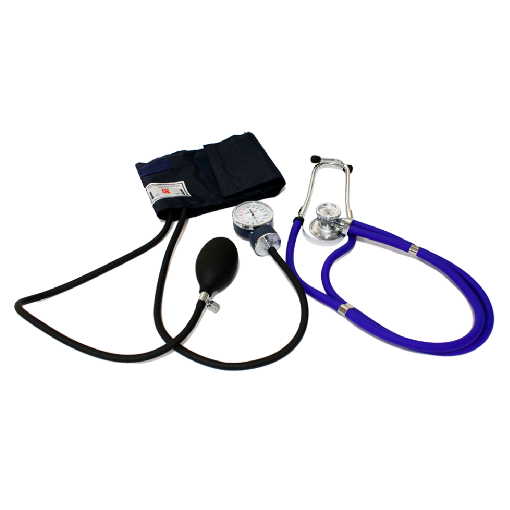 Kit para toma de tensión arterial en estuche nylon poliéster, tensiómetro aneroide de bolsillo uso adulto (BK2002), brazalete nylon, manómetro escala de 0 – 300 mm/hg., subdivisión manómetro 2 mm/hg., pera en látex con válvula. Fonendoscopio tipo rappaport (BK3003), uso adulto y pediátrico (edad escolar), campana doble servicio, tipo enfermera, tubo binoular en PVC, tubo doble en polipropileno, olivas fijas, colores surtidos. Incluye estuche en Nylon.