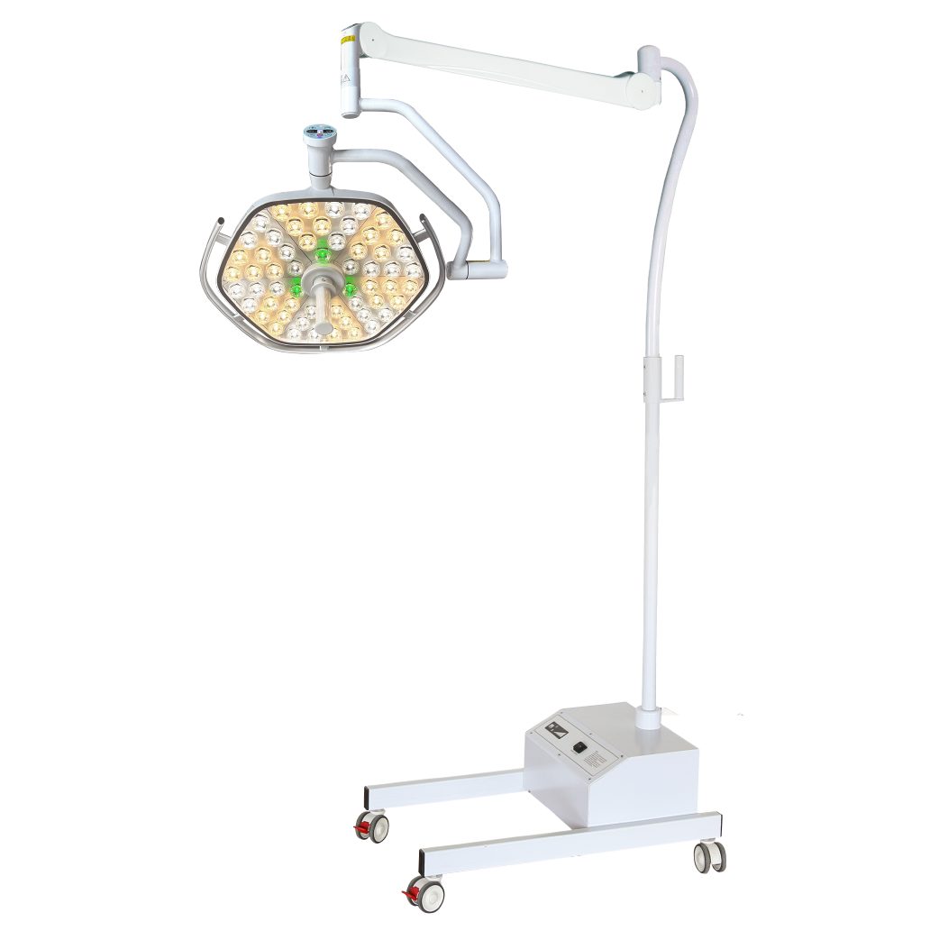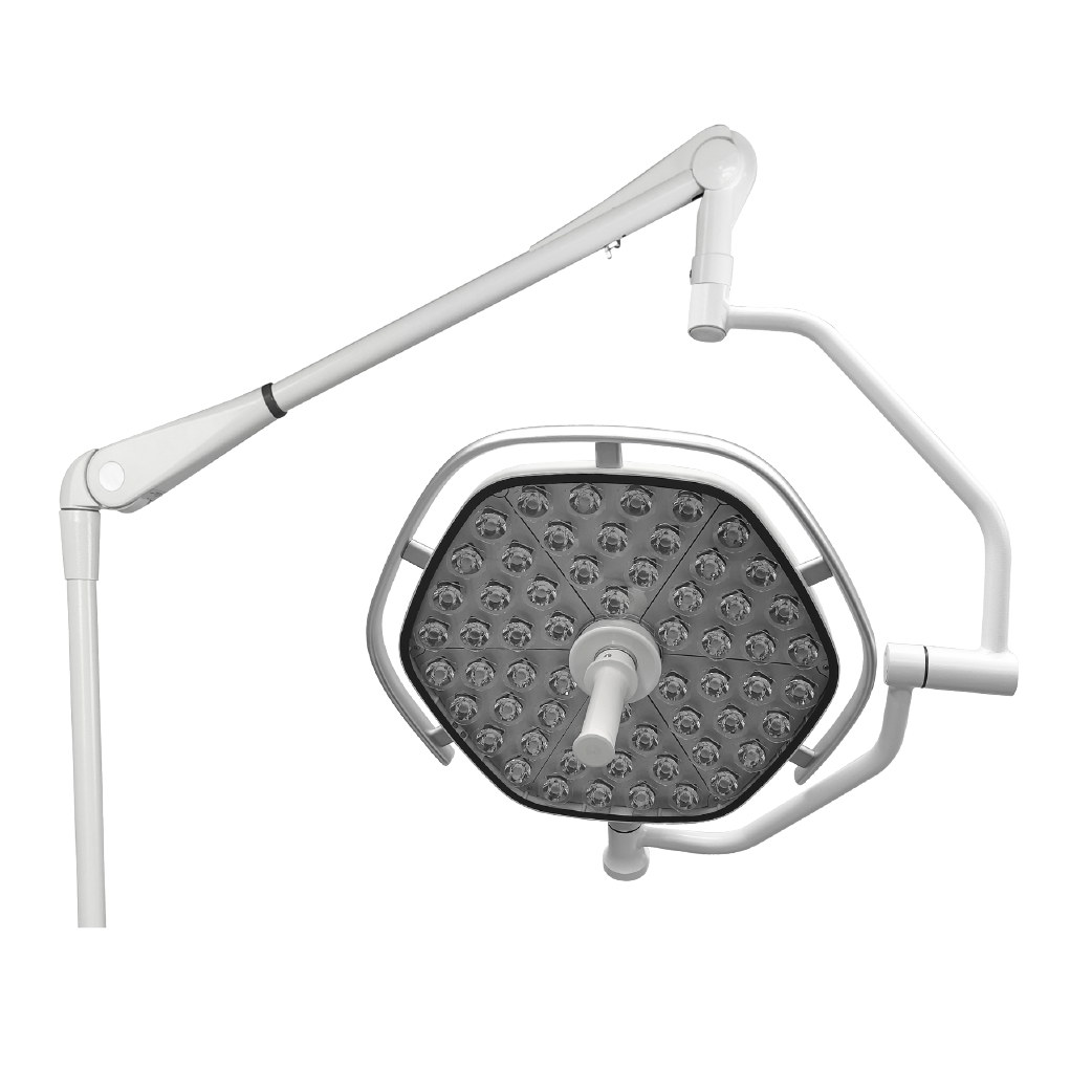 Serie 500E-LED, con iluminación LED fría, sin sombras. Luz uniforme y homogénea en la cavidad. Iluminación >140.000 LUX. Temperatura/Color 5.000 + 500K. Batería recargable, duración +-6 horas. El tamaño del campo de iluminación es de 250 – 300 mm, indice de reducción de color 93. Profundidad de iluminación 1.400 mm. Irradiación total 534 W/M2. Diámetro de satélite de la lámpara 500 mm Aprox. Potencia del bulbo LED 60W. Equipada con botón de iluminación modo endoscopía, vida útil del bulbo LED > 50.000 h. Alimentación eléctrica 110 voltios 50/60 hz. Ajuste de luz automático, 8 etapas continuas. Brazo de suspensión estable. Mango desechable. Base rodante con ruedas de 3”. Incluye manual de uso. Altura útil de satélite: +- 200 cm. Altura libre necesaria: 300 cm.