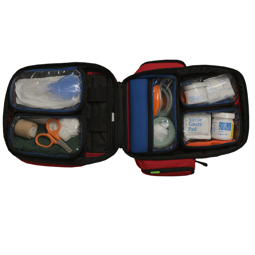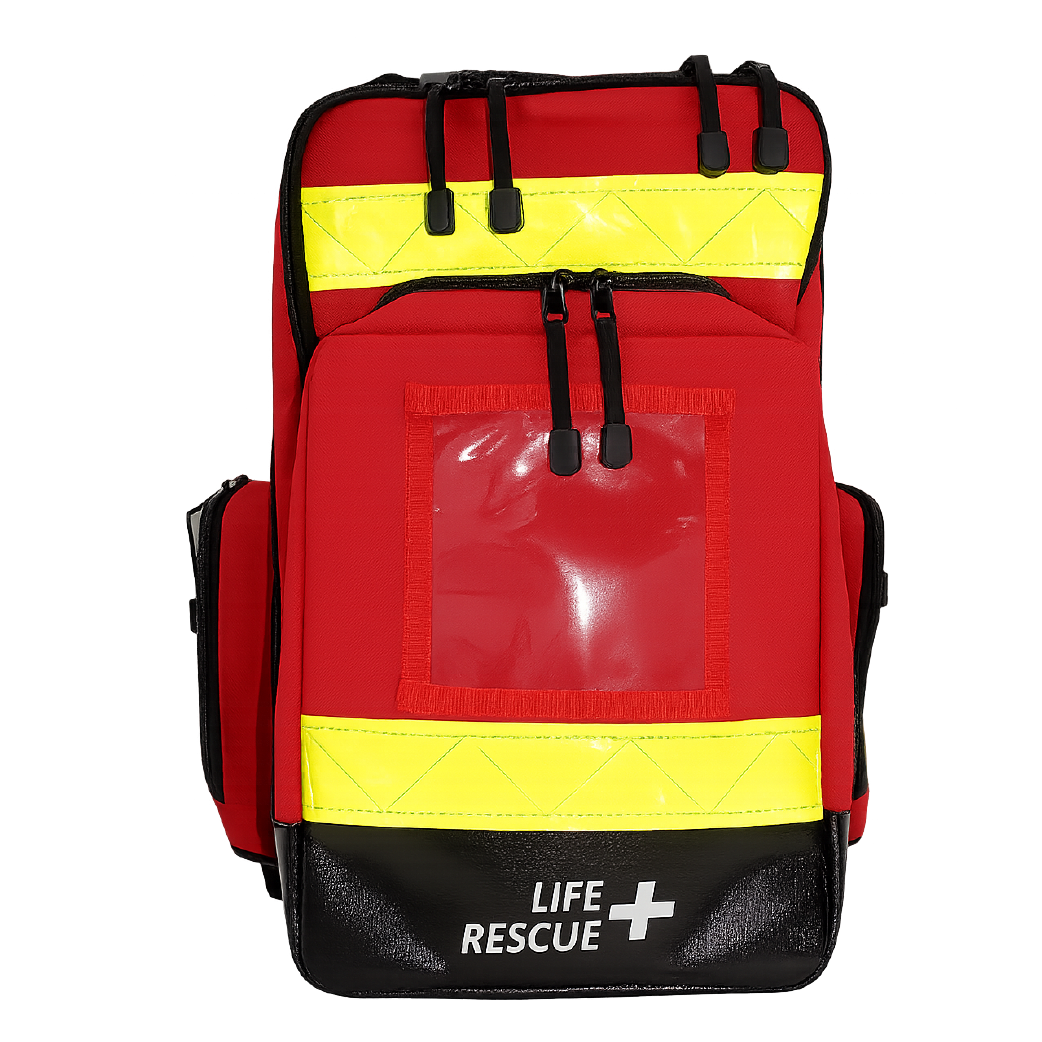 Bolsas internas para guardar suministros. Base interior: 2 bolsas de colores en la base: rojo y naranja (22 x 8 x 6 cm cada una) 1 bolsa azul en la base (24 x 19 x 7 cm) Tapa interior: 2 bolsas con velcro y asa de transporte (30 x 10 x 3 cm cada una) 6 presillas elásticas en la tapa 2 bolsillos externos rontales: uno grande para bolsas intravenosas y de vía aérea y uno pequeño con porta documentos Bolsillos laterales izquierdos para acceder rápidamente a lo esencial. Asas de transporte superiores robustas. Correas de transporte tipo mochila con bolsa de almacenamiento en la parte trasera. Color: rojo, azul marino, azul marino impermeable y rojo impermeable. Base de goma. Material: Polyester 600d / opciones impermeables.
