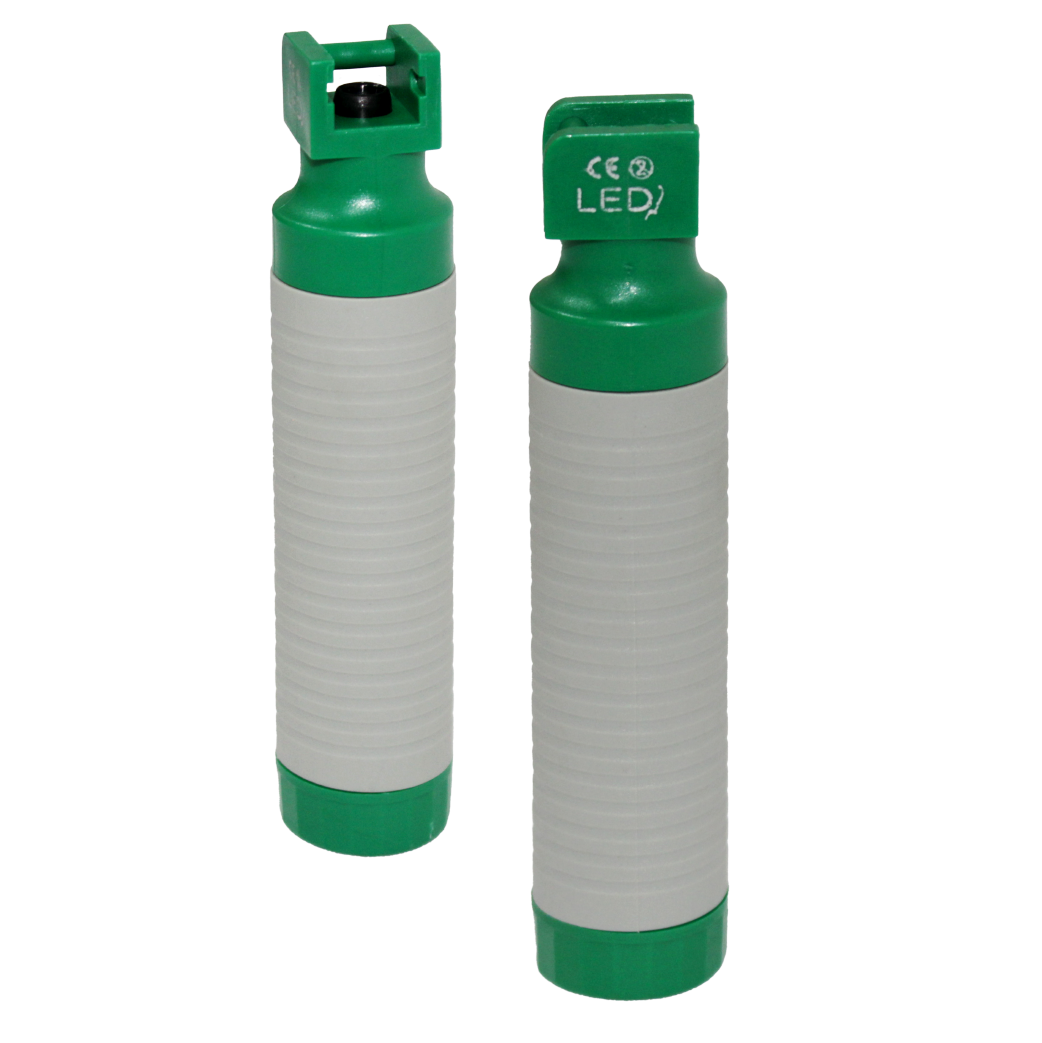 Mango desechable para laringoscopio con sistema de fibra óptica. Iluminación LED 2.5 VOL. Estriado para mejor agarre, bulbo de iluminación incorporado, para un solo uso. Fabricado baja el estándar ISO 7376/3. Incluye batería no intercambiable.