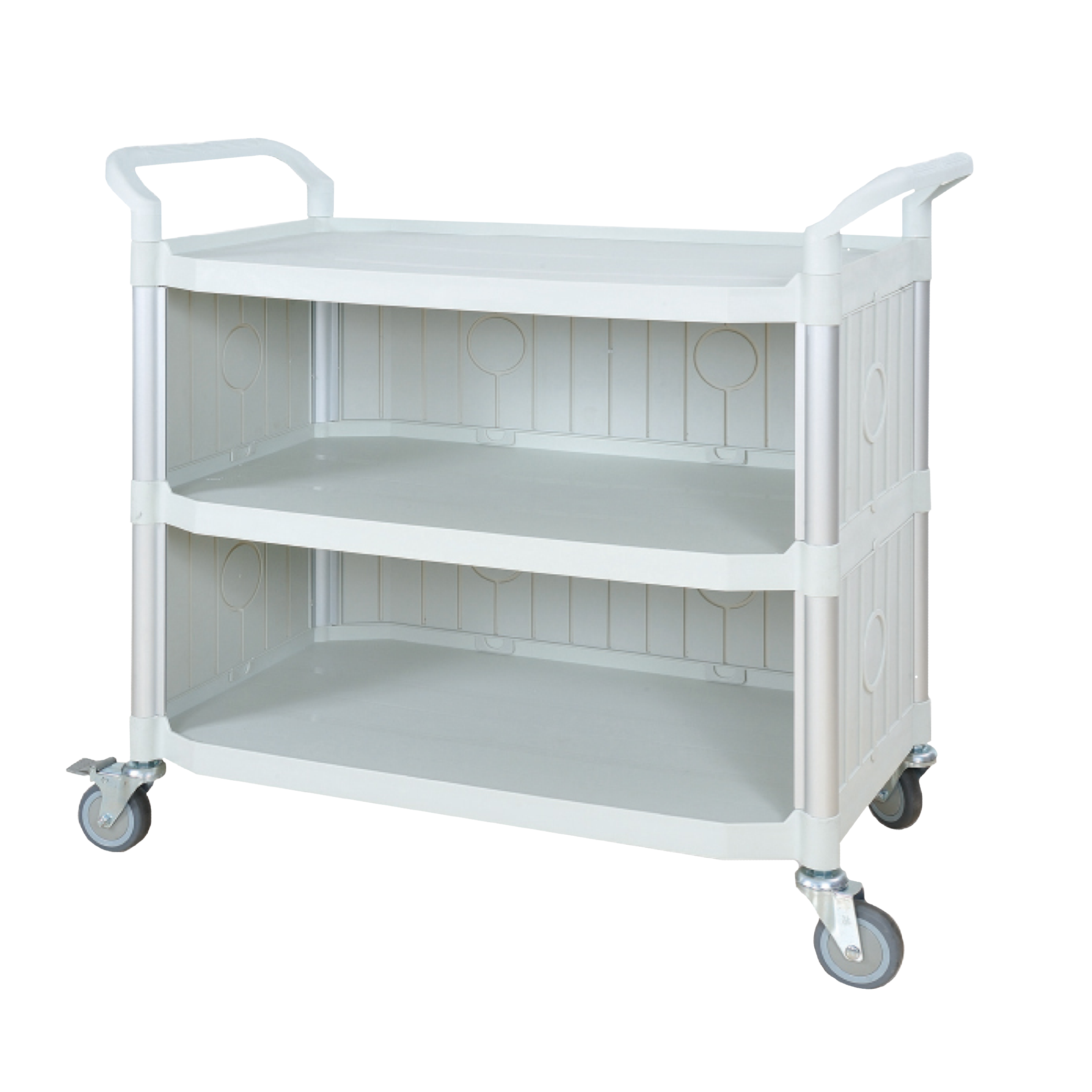 Estructura tubular en aluminio de 1″, cubierta y entrepaño en polipropileno con rebordes, ruedas giratorias en caucho de 3″ antiestáticas dos con freno. Pasamanos o manijas en polipropileno resistente a soluciones corrosivas. Medidas Aprox.: 102 cm x 110 cm x 52 cm.