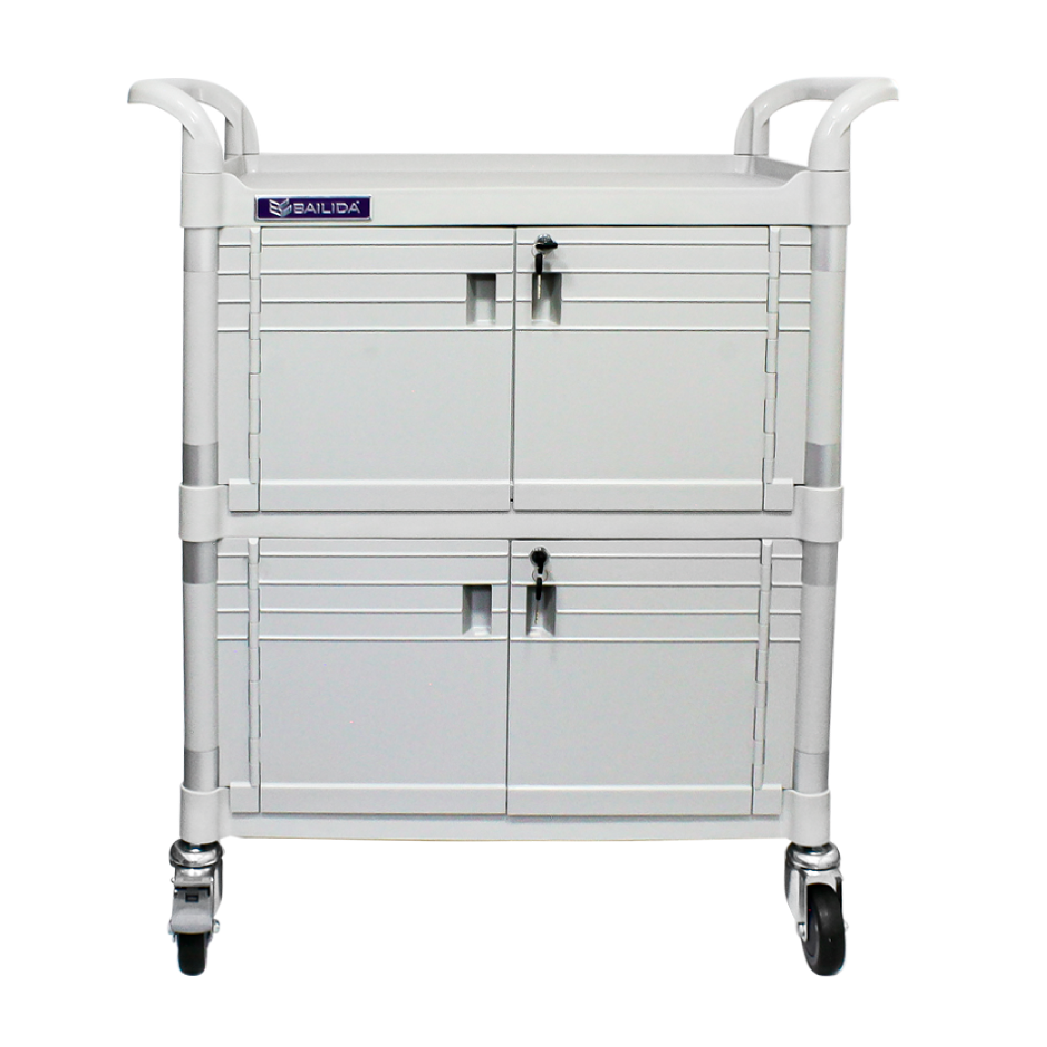 La mesa multifuncional para procedimientos cuenta con estructura tubular en aluminio, con paneles, pasamanos, entrepaños y puertas en PVC. Ruedas giratorias de 4″, 2 con freno. Resistente a soluciones corrosivas. Completamente desarmable. Medidas: 104 cm x 76 cm x 49 cm.