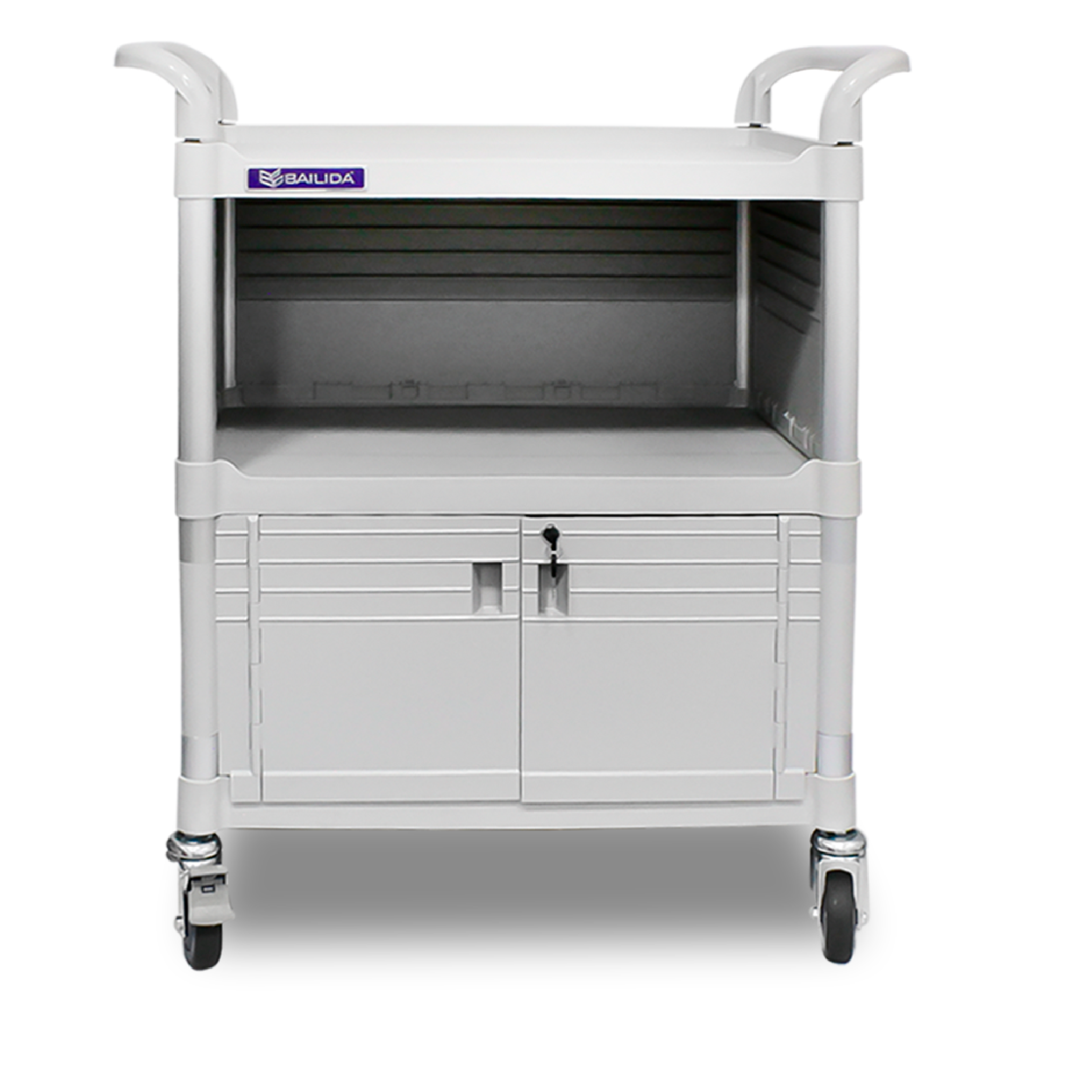 La mesa multifuncional para procedimientos cuenta con estructura tubular en aluminio, con paneles, pasamanos, entrepaños y puertas en PVC. Ruedas giratorias de 4″, 2 con freno. Resistente a soluciones corrosivas. Completamente desarmable. Medidas: Frente: 70.5cm x Fondo: 43.5cm x Alto: 90cm.