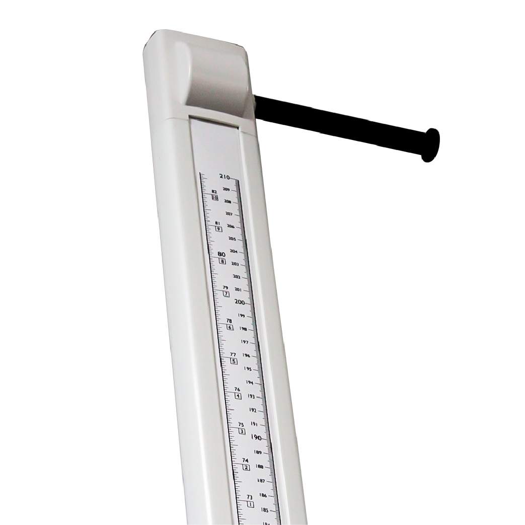 El tallímetro HM202P contiene una base de piso metálica, con un rango de medición de 20 a 205 cms. La plataforma amplia, con superficie nivelada, está diseñada para uso en conjunto con la balanza MS6111 y MS6110. Se pueden incorporar escalas de cinta retráctil (opcional). Es un dispositivo ligero y portátil con tope de cabeza que permite visualizar la estatura exacta. Incluye maleta de transporte. Las medidas del dispositivo son 406 x 585 x 2200 mm, con un peso de 4.9 Kgs.